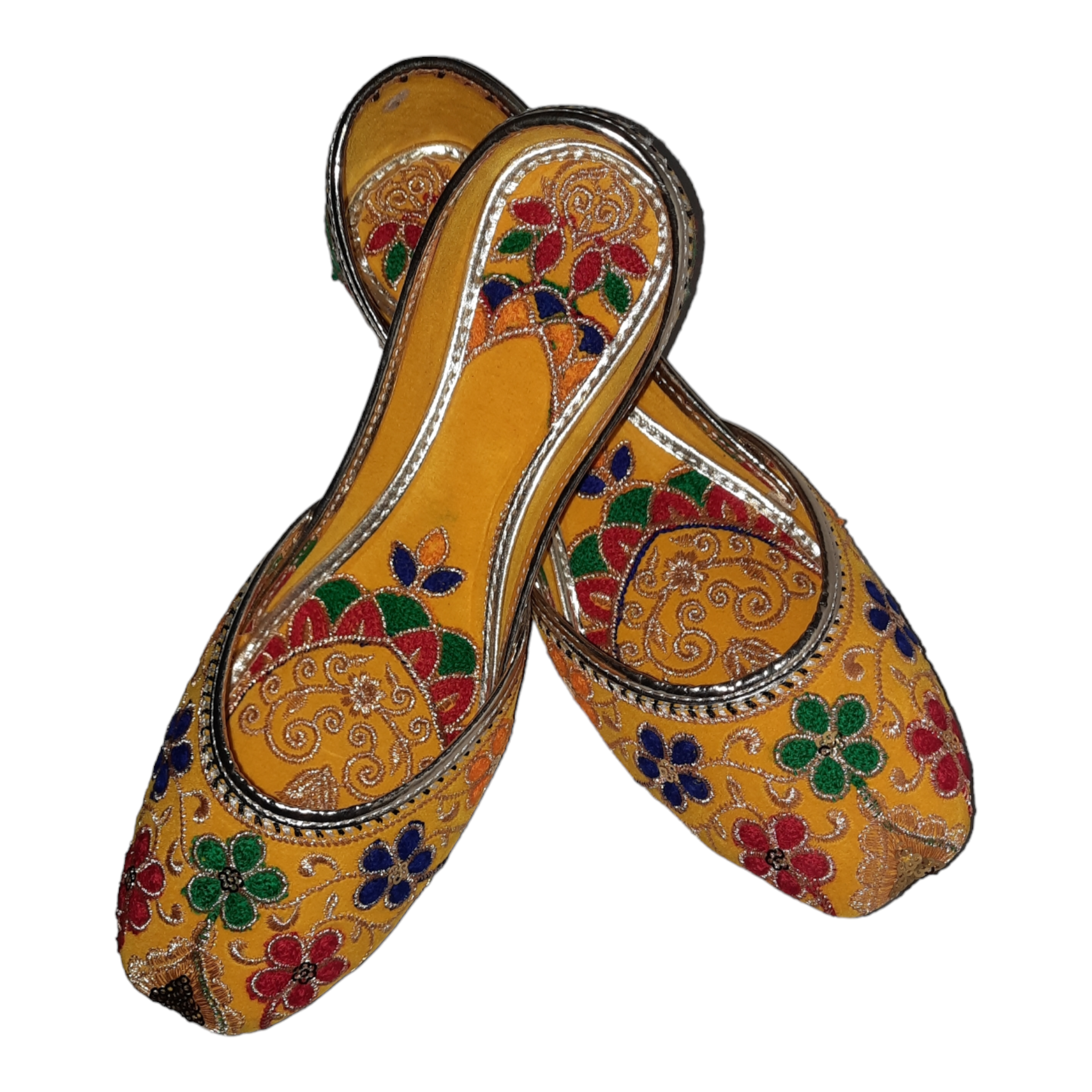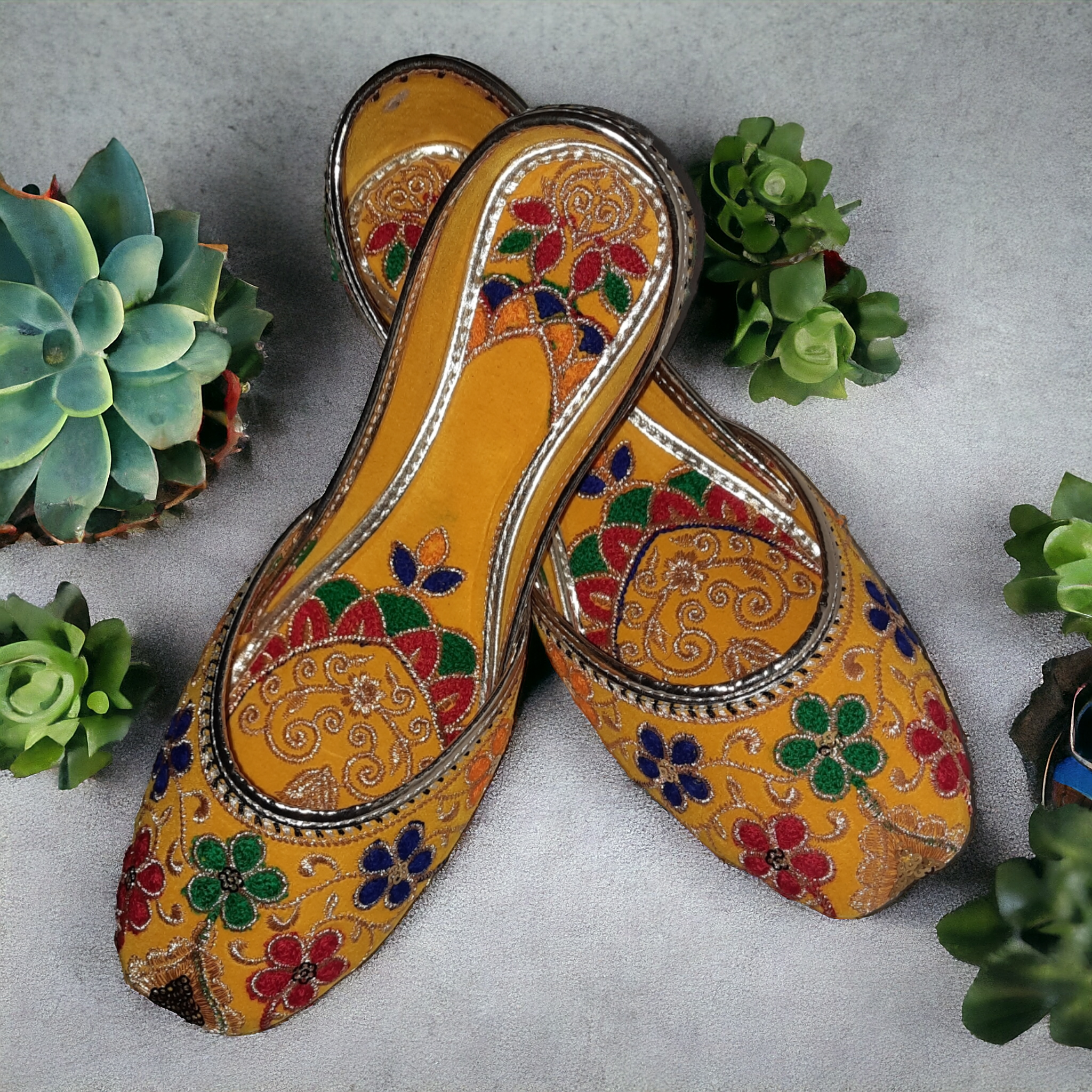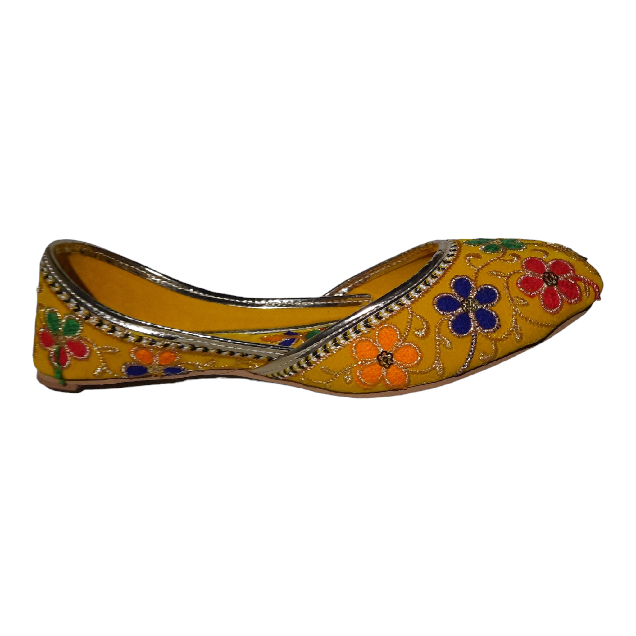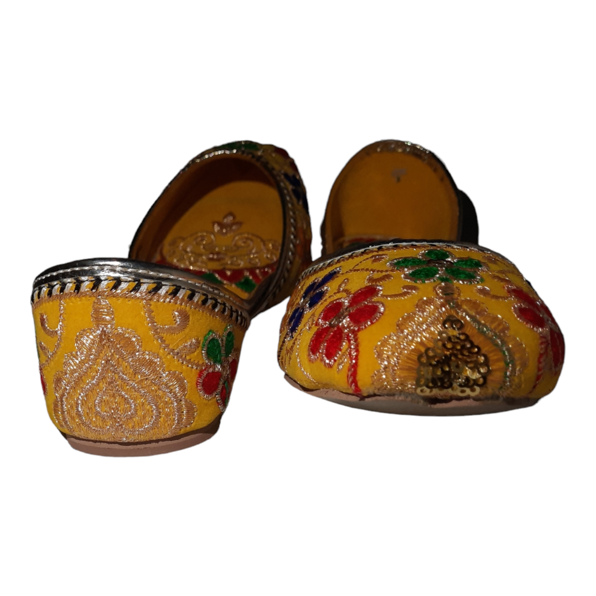 Upgrade your wardrobe with Afsara's Multi Embroidery Khussa. The stunning yellow color and intricate Mehandi embroidery make it ideal for weddings and formal events. Its padded insole ensures all-day comfort and the full embroidery adds a touch of elegance. Upgrade your style game with this must-have khussa.