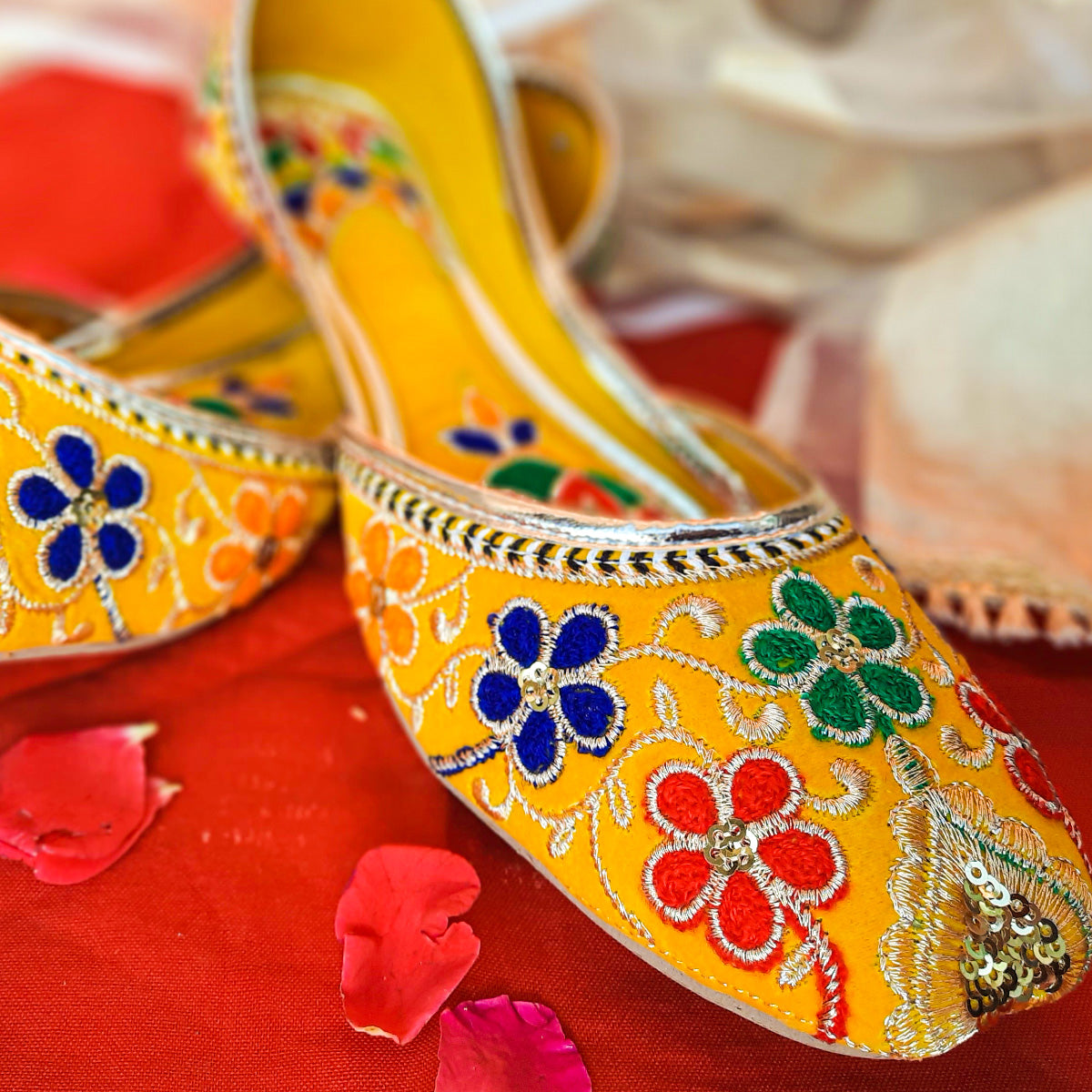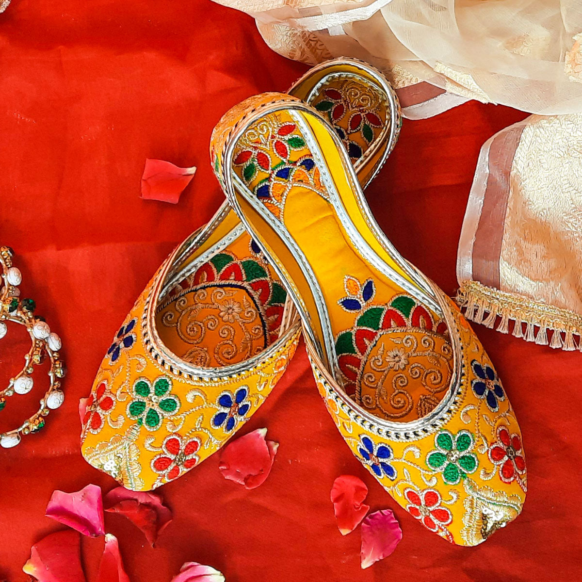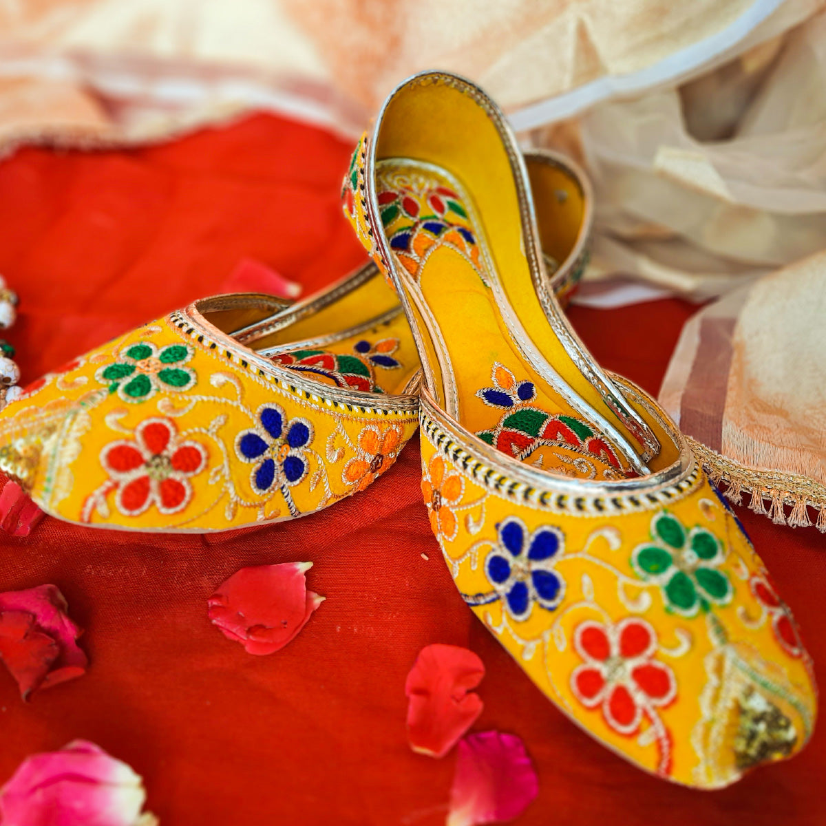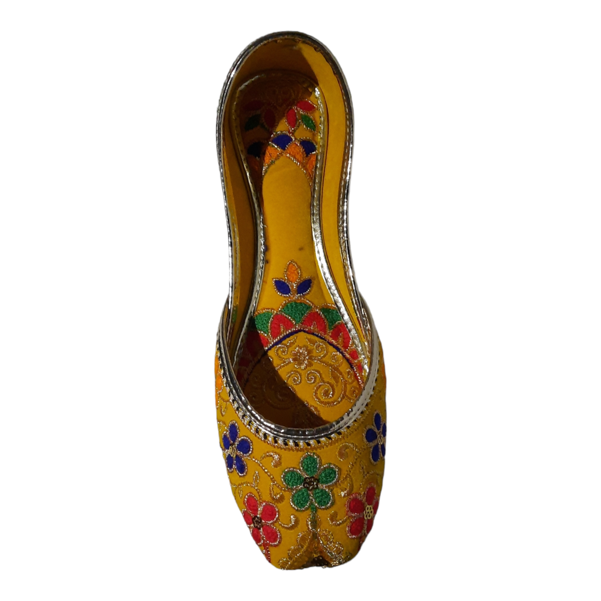 Upgrade your wardrobe with Afsara's Multi Embroidery Khussa. The stunning yellow color and intricate Mehandi embroidery make it ideal for weddings and formal events. Its padded insole ensures all-day comfort and the full embroidery adds a touch of elegance. Upgrade your style game with this must-have khussa.