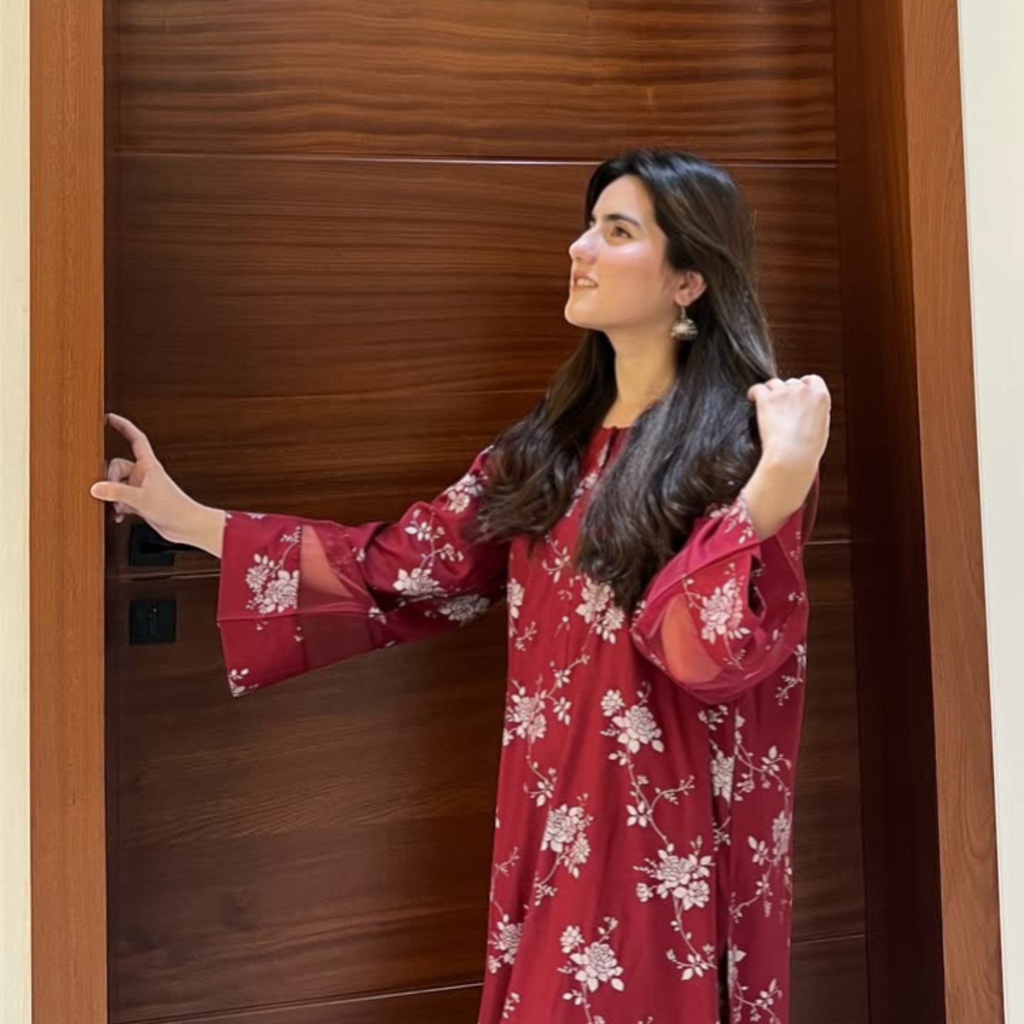 ✔ Rich maroon base with vibrant floral print