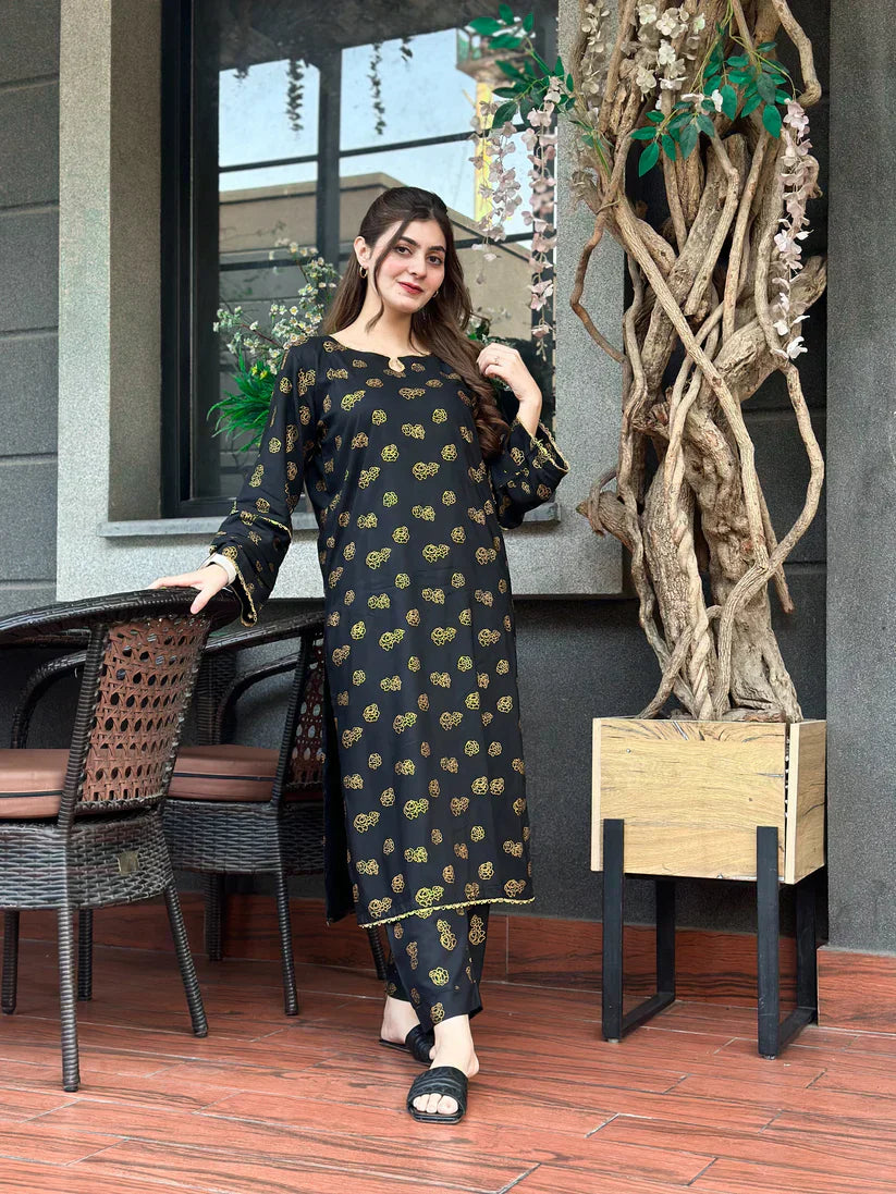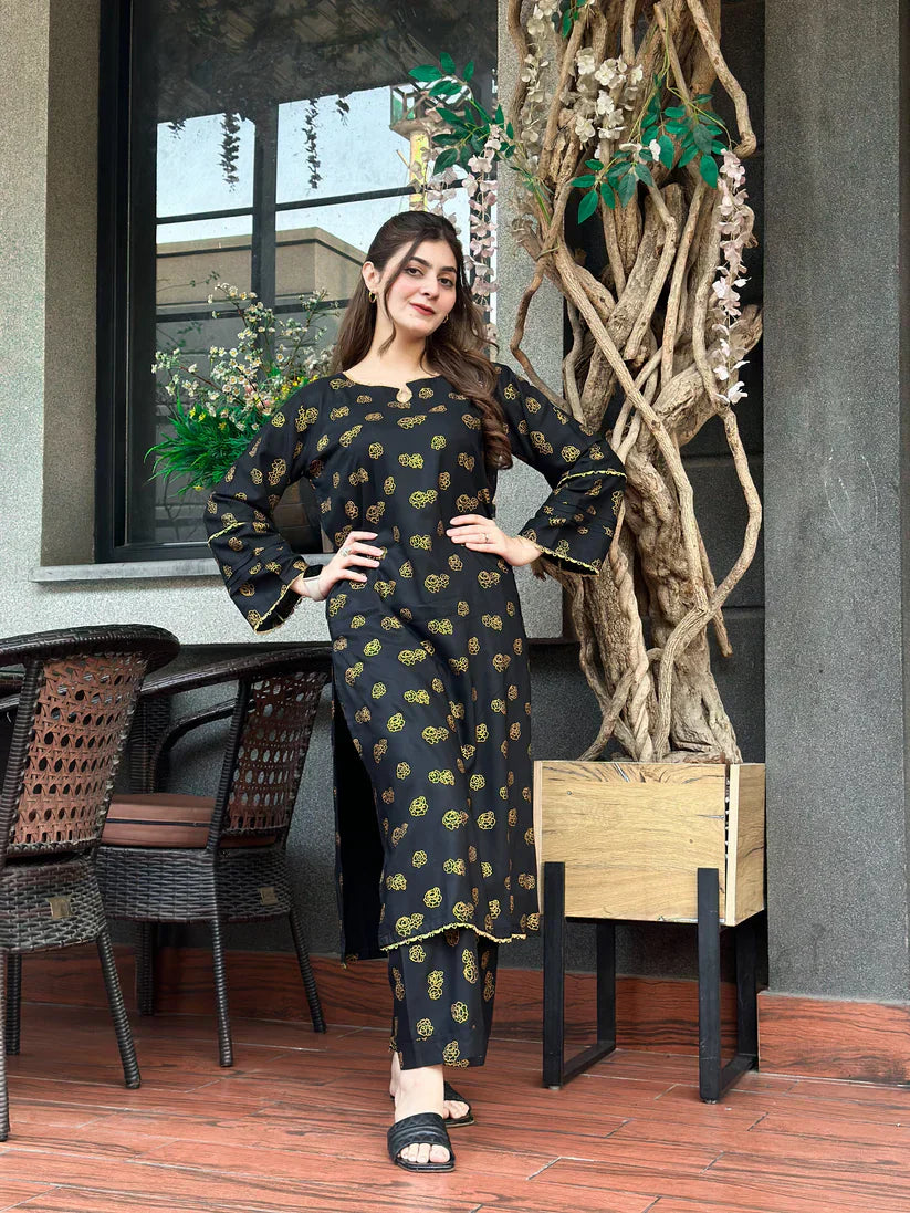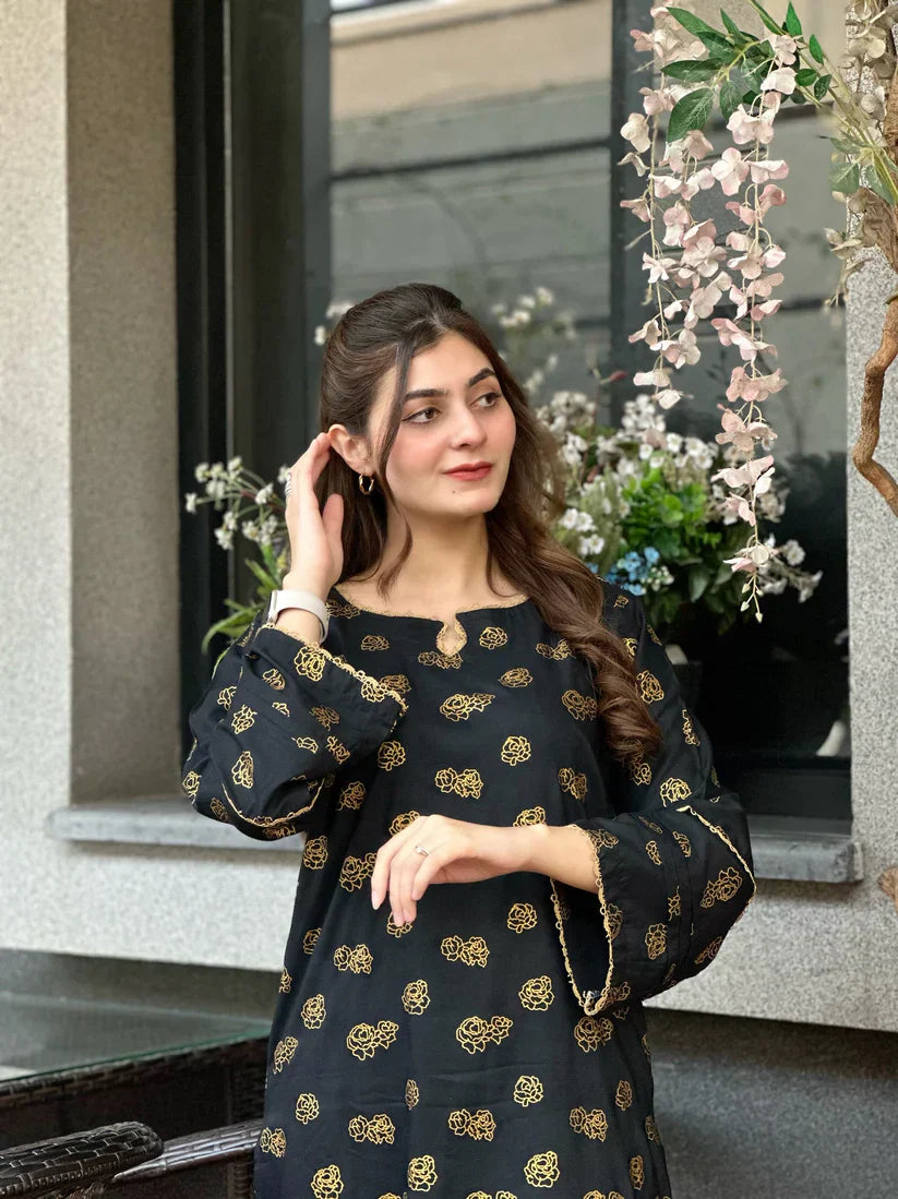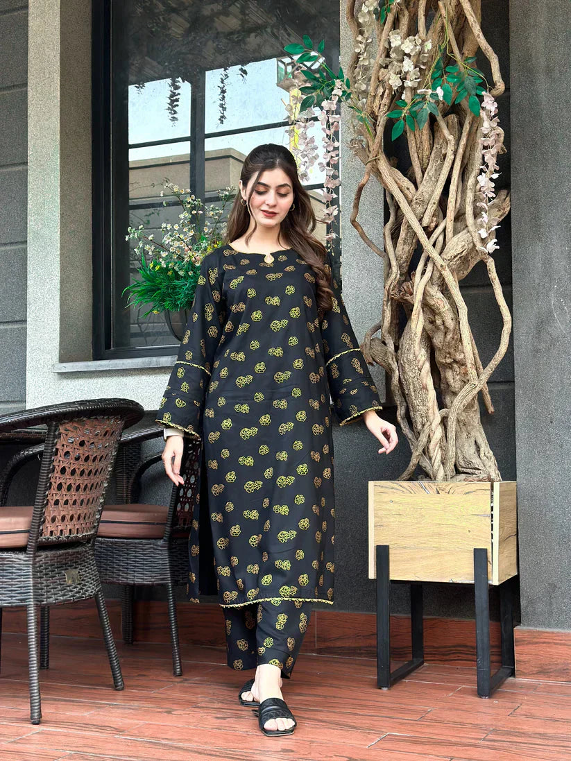Step into effortless sophistication with Noir Zarqa – a striking black and gold printed outfit designed to leave a lasting impression. Made from premium Arabic Lawn, this 2-piece stitched suit offers a graceful balance of tradition and trend, perfect for festive evenings, casual outings, or special gatherings.